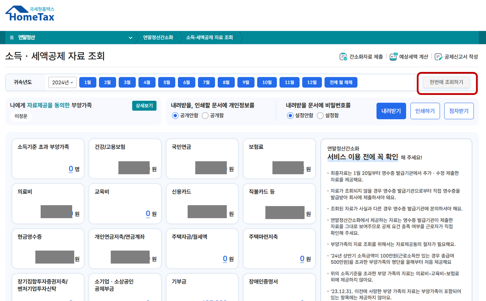 월별로 하나씩 클릭해서 봐도 되고, 오른쪽에 있는 한번에 조회하기를 클릭하시면 한번에 조실 수 있습니다.