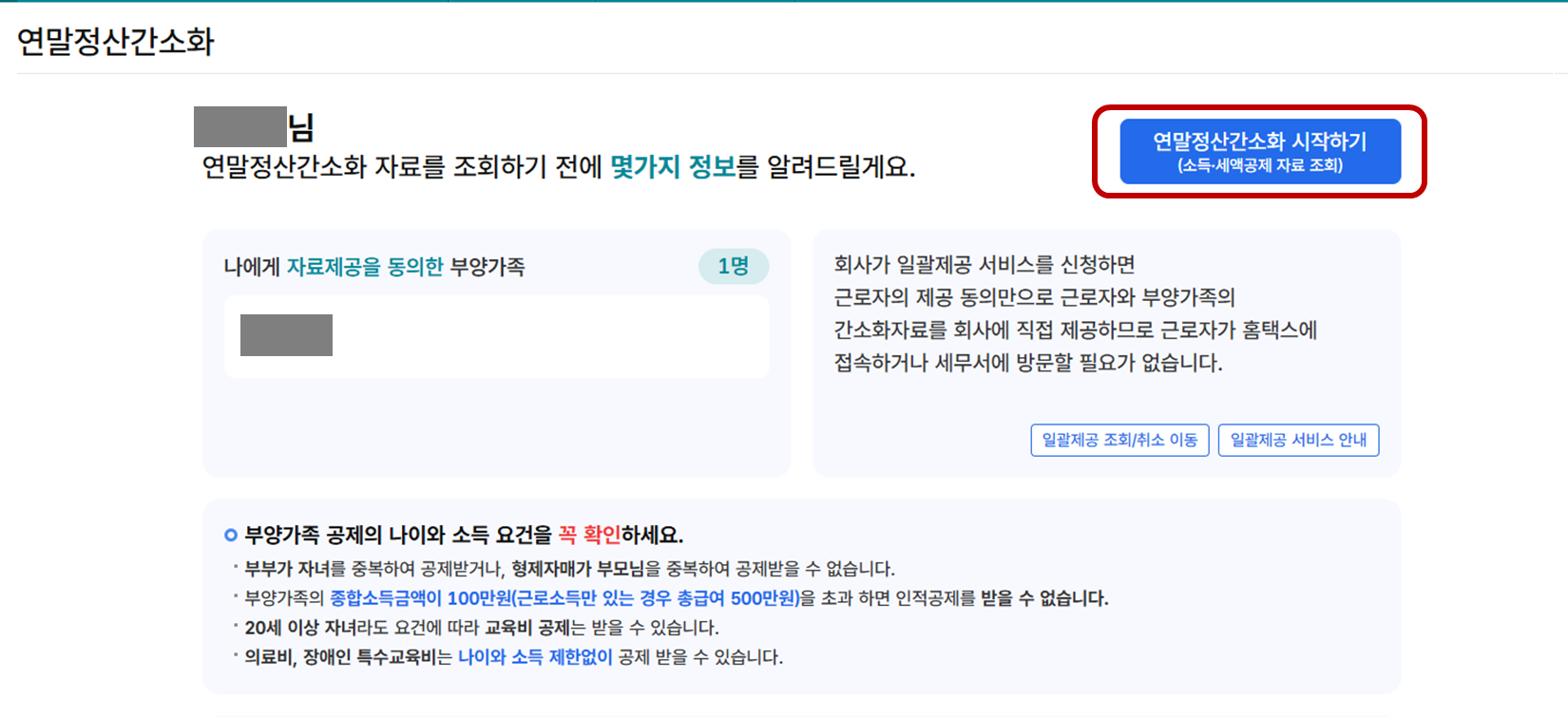 확인을 했으면 오른쪽 상단에 있는 연말정산간소화 시작하기 버튼을 클릭한다