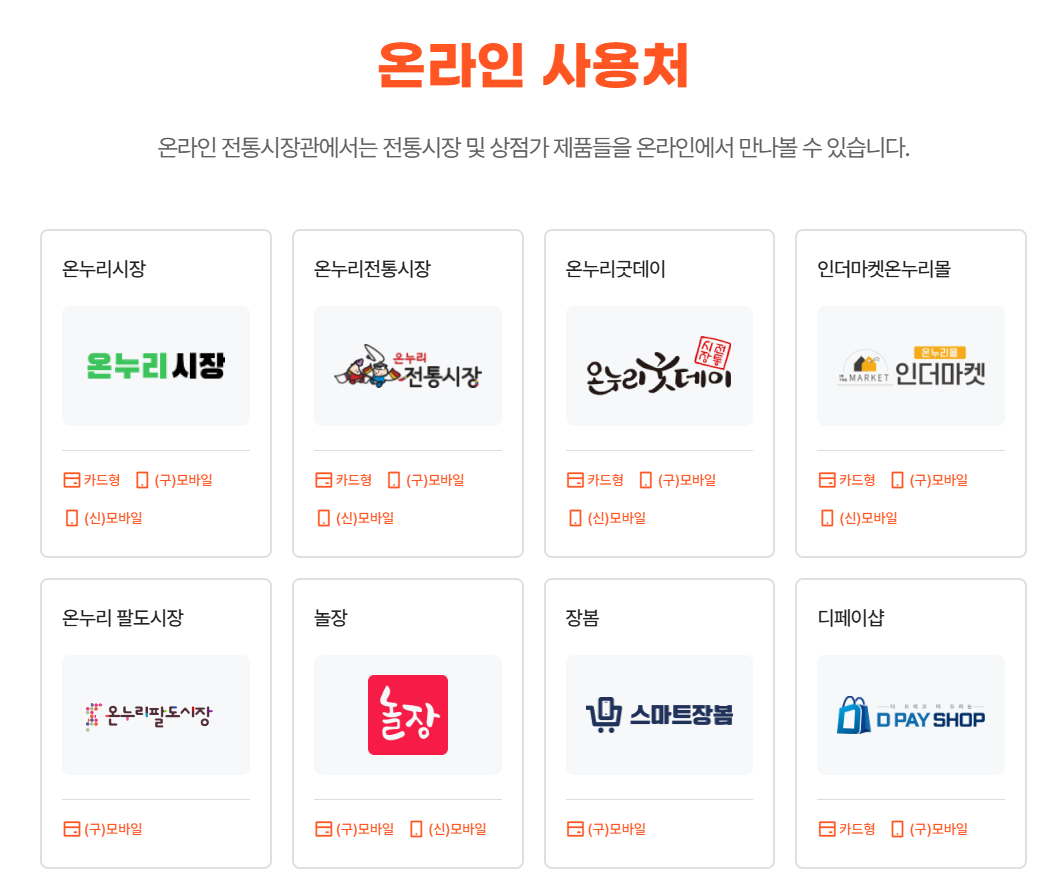 사용처는 아래 들어가시면 각 종류별로 사용 가능한 가맹점 확인이 가능합니다!