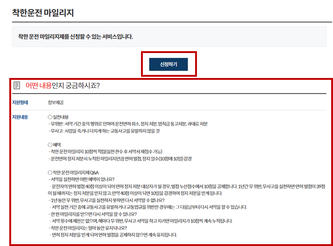 운전자가 교통법규를 준수하겠다는 서약 후 1년 동안 무사고 무위반 실천하는 경우 10점씩 마일리지를 적립해 주는 제도입니다.