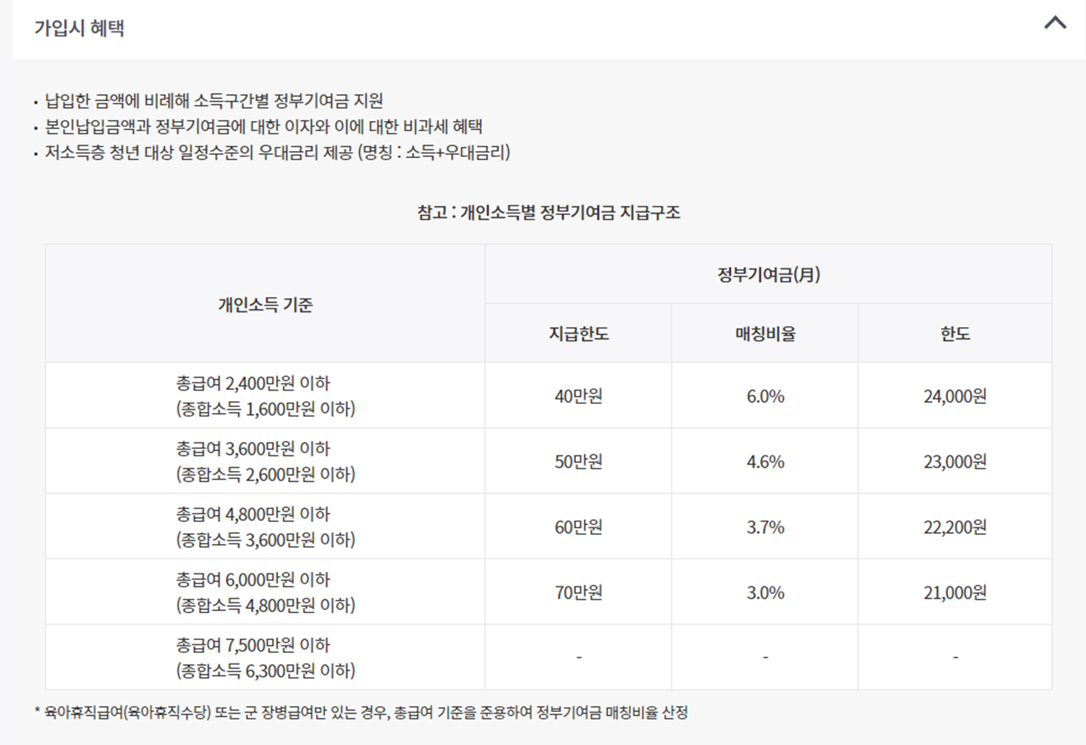 여기서 추가적인 혜택이 제공되는 것은 정부기여금인데, 지급구조를 참고해 두셔서 본인의 소득 기준에 맞게 혜택을 이용하시면 됩니다.