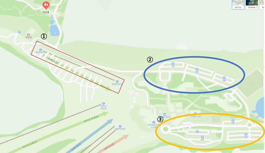 2번은 주차 1, 2, 3, 4 동 주차하신 분들 타는 리프트 장소입니다. (리프트는 무료입니다.)