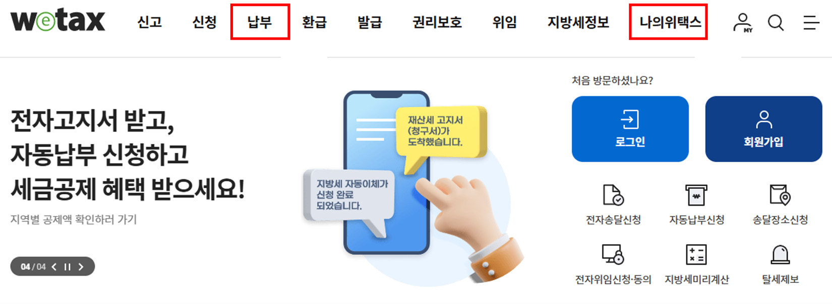 홈페이지 접속 후 로그인을 하고 상단의 '납부' 또는 '나의 위택스'를 메뉴를 선택하면 조회 및 납부가 가능합니다.
