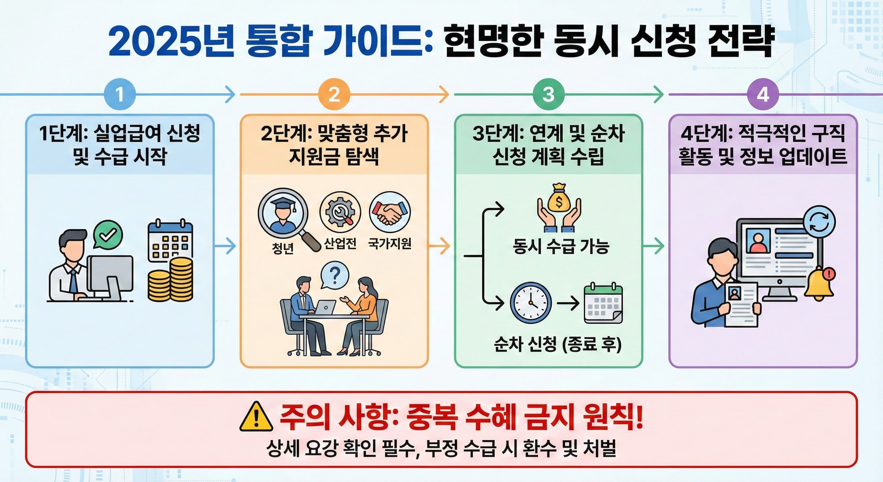 실업급여와 동시 수급이 가능한 지원금은 바로 신청을 준비하고, 동시 수급이 불가능한 지원금(국민취업지원제도, 청년구직활동지원금 등)은 실업급여 종료 시점에 맞춰 순차적으로 신청할 계획을 세웁니다. 이때 빈틈이 생기지 않도록 미리 준비하는 것이 핵심이에요. - 4단계: 적극적인 구직 활동 및 정보 업데이트