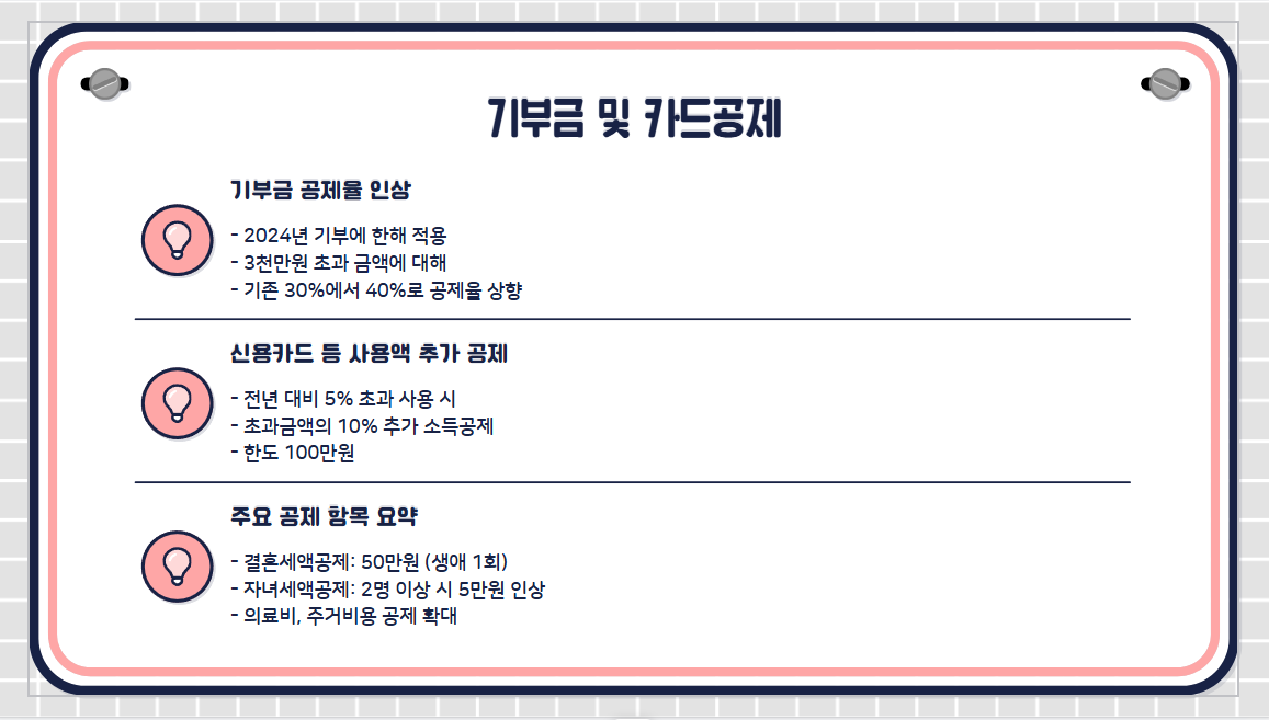 체크카드와 현금영수증 활용: 신용카드보다 높은 공제율이 제공되므로 체크카드와 현금영수증을 활용하세요.
